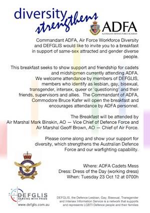 DEFGLIS in conjunction with the Australian Defence Force Academy, and Air Force Workforce Diversity would like to invite DEFGLIS members in the Canberra region to a "Diversity Strengthens" breakfast on Tuesday 23 Oct.